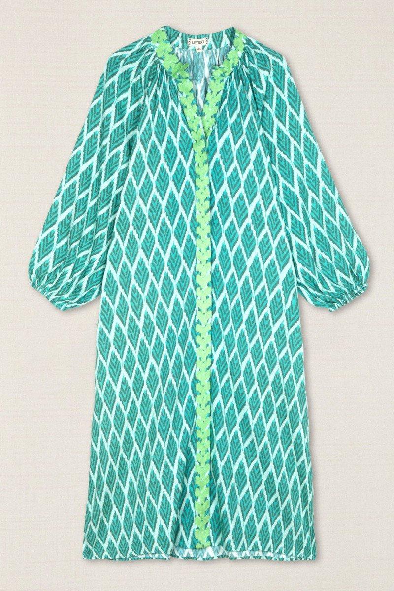 Como este vestido confeccionado en viscosa ligera, en tonos turquesa y lima, en el que destacan sus bordados de hilo aterciopelado en cuello y frontal, que aportan textura y carácter. El cuello mao y los puños fruncidos enmarcan un diseño elegante y versátil, ideal para elevar un outfit de día o de noche. Cierre con botones. Combínalo con otros complementos de la firma y crea un total look Latido único.