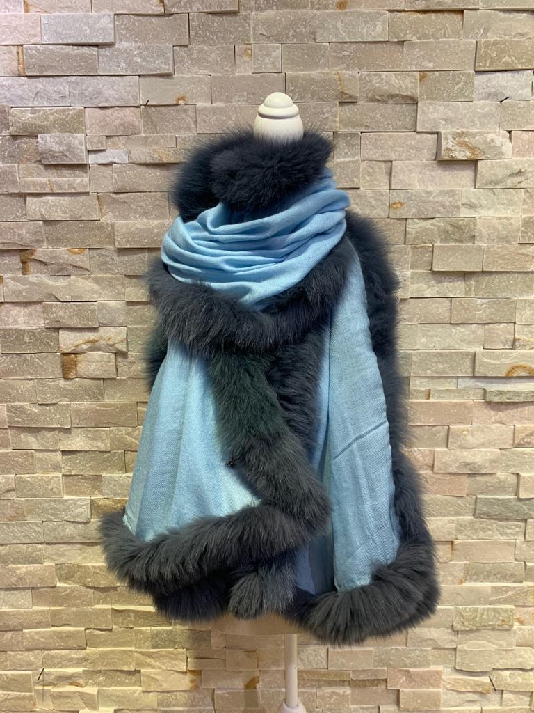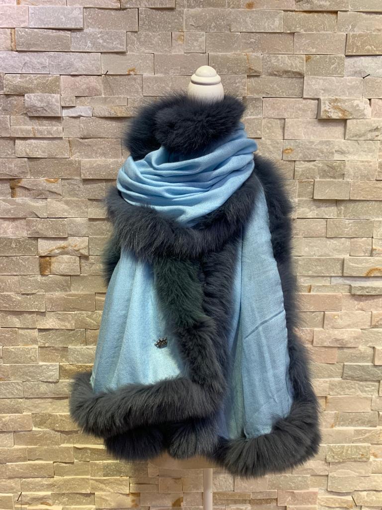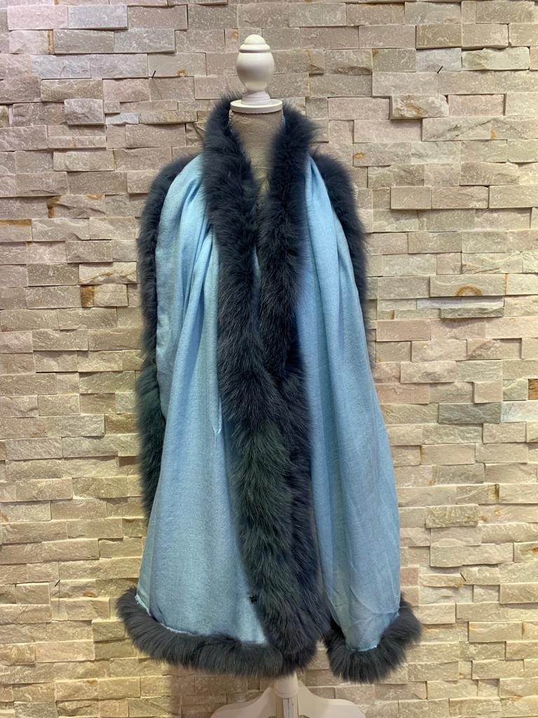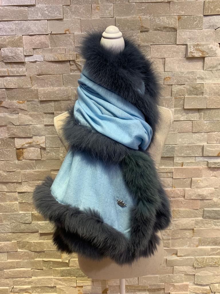 Bufanda pashmina de cashmere lisa en tono azul cielo ribeteada con pelo natural de zorro en el mismo tono.