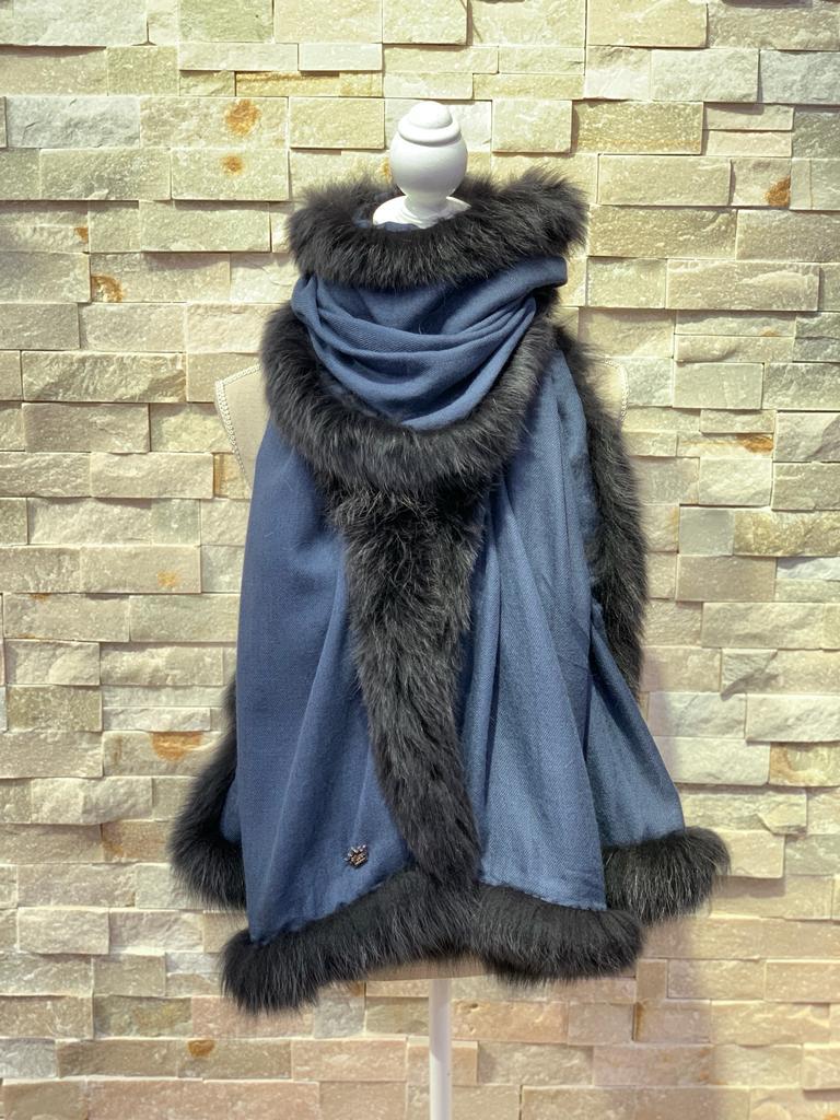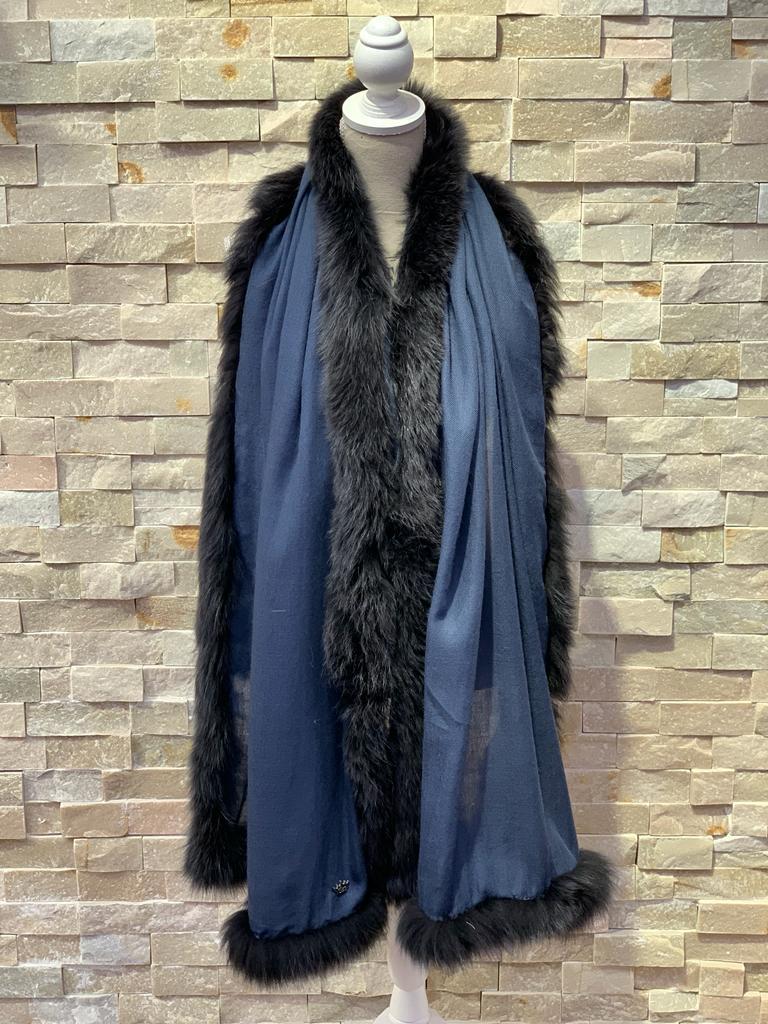 Bufanda pashmina de cashmere lisa en tono azul marino claro ribeteada con pelo natural de zorro en tono negro con matices azules y grises.