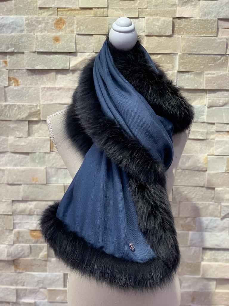 Bufanda cashmere azul marino ribeteada en pelo natural al tono