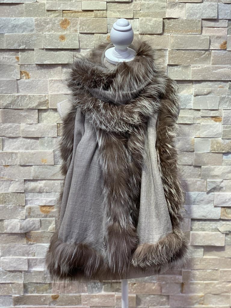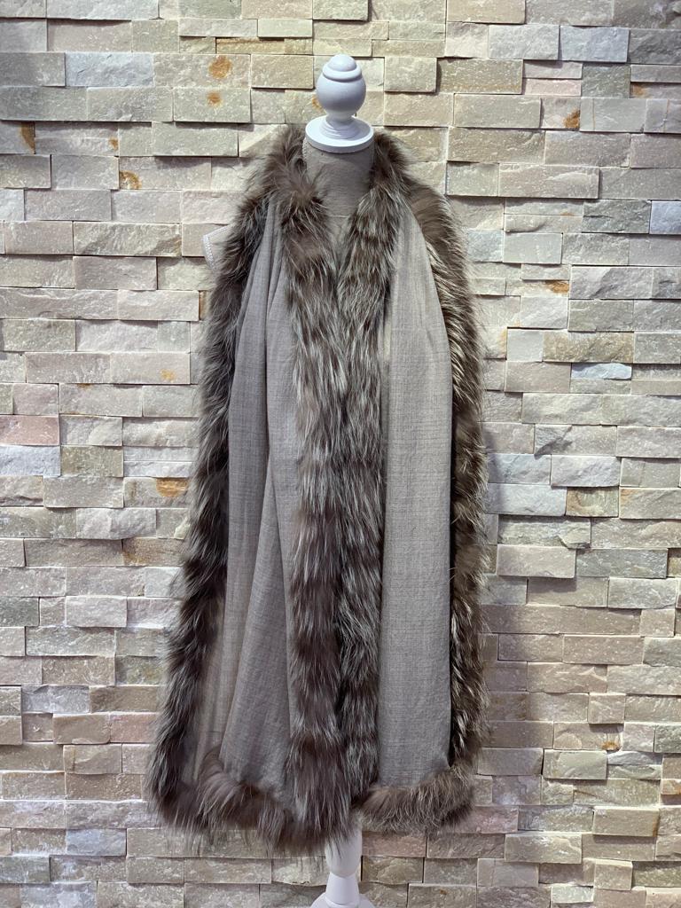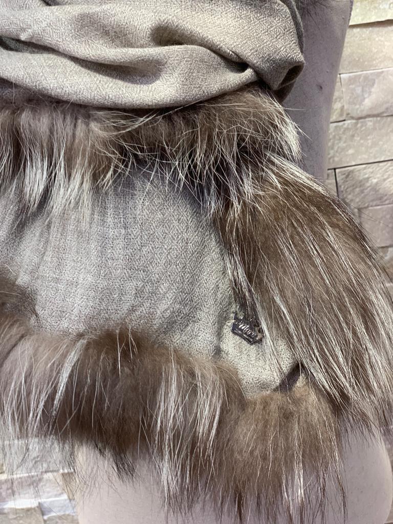 Bufanda pashmina de cashmere lisa en tono gris medio ribeteada con pelo natural de zorro también en color grisáceo más oscuro con matices blancos.
