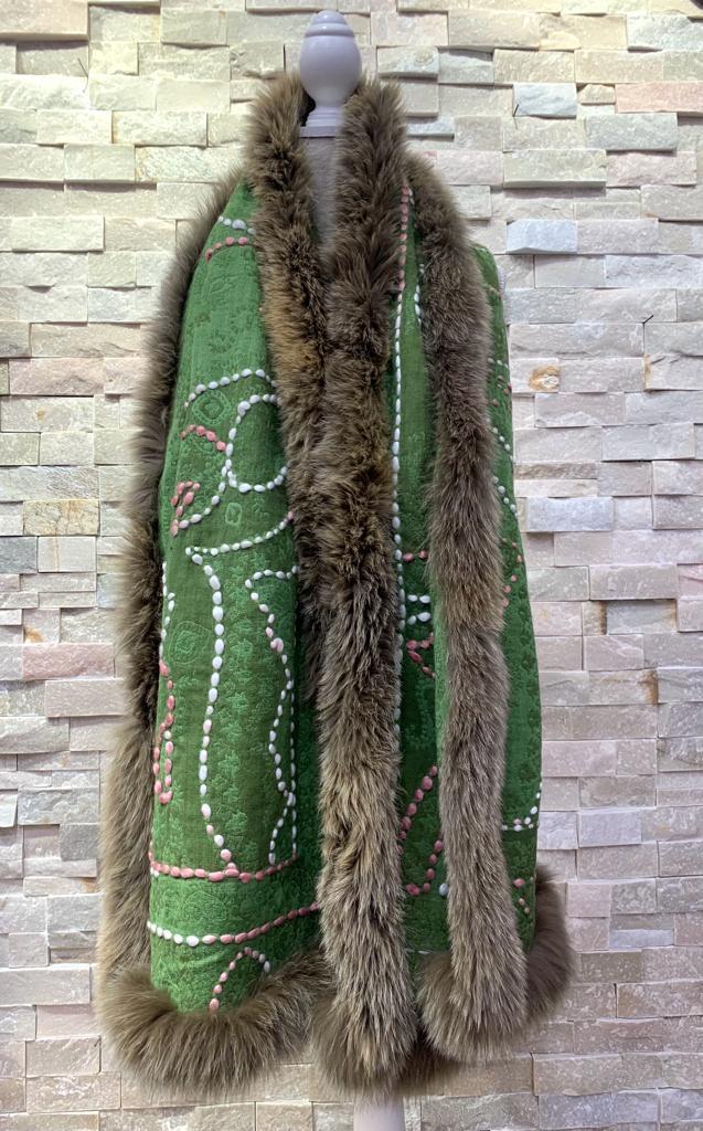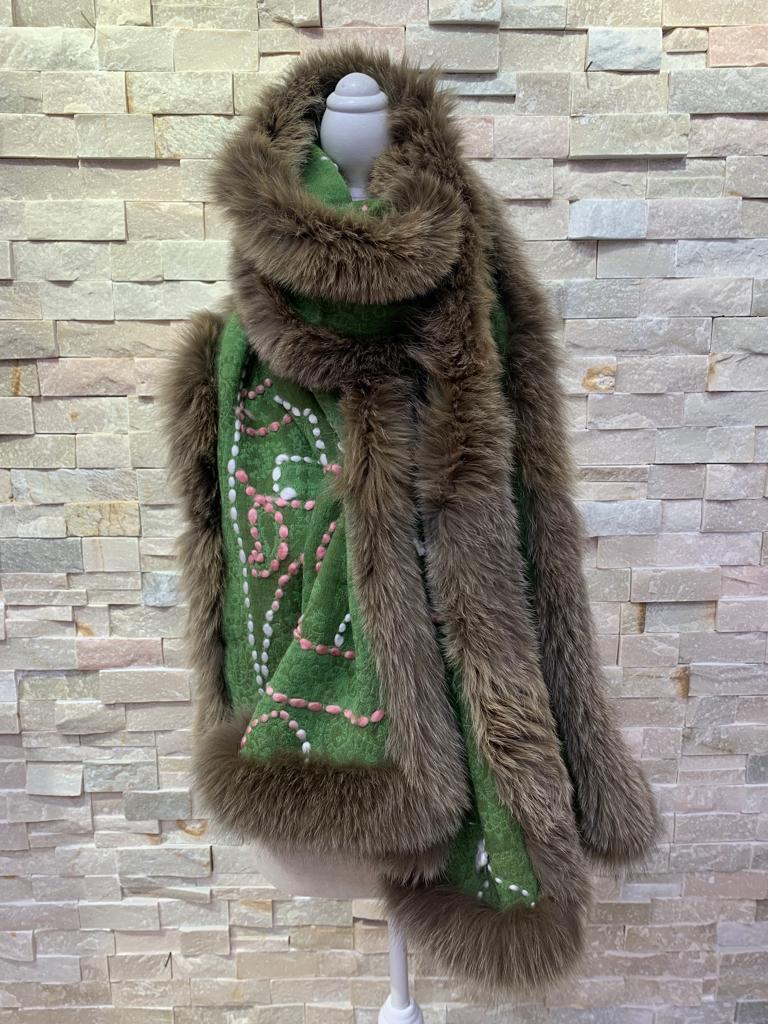 Bufanda pashmina de cashmere en color verder con detalles bordados en diferentes tonos pastel y ribeteada con pelo natural de zorro en color marrón grisáceo oscuro.