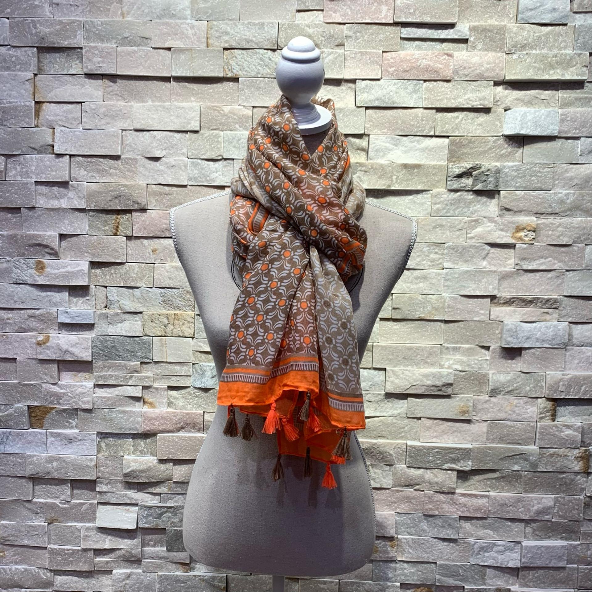 Pañuelo estampado geométrico marrón y naranja