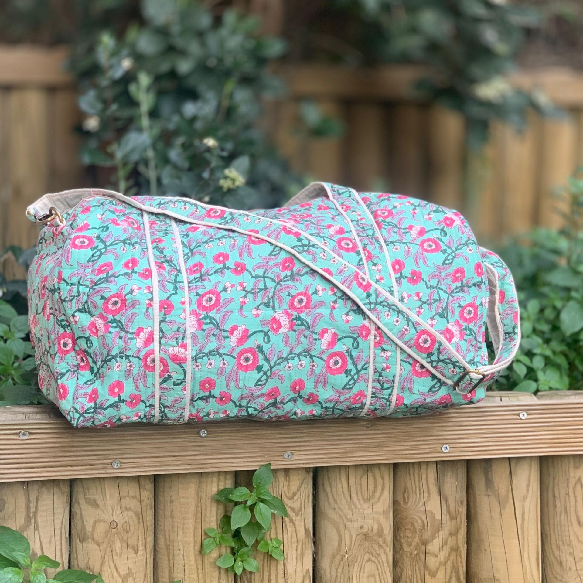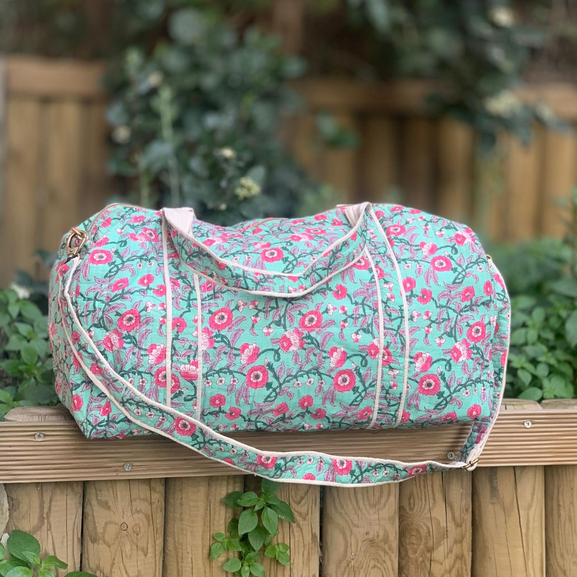 El bolso perfecto para cualquier viaje o escapada. Muy ligero, realizado en tela acolchada con un original estampado de flores en tonos rosa fucsia, con motivos vegetales en color verde, todo ello sobre fondo azul turquesa.