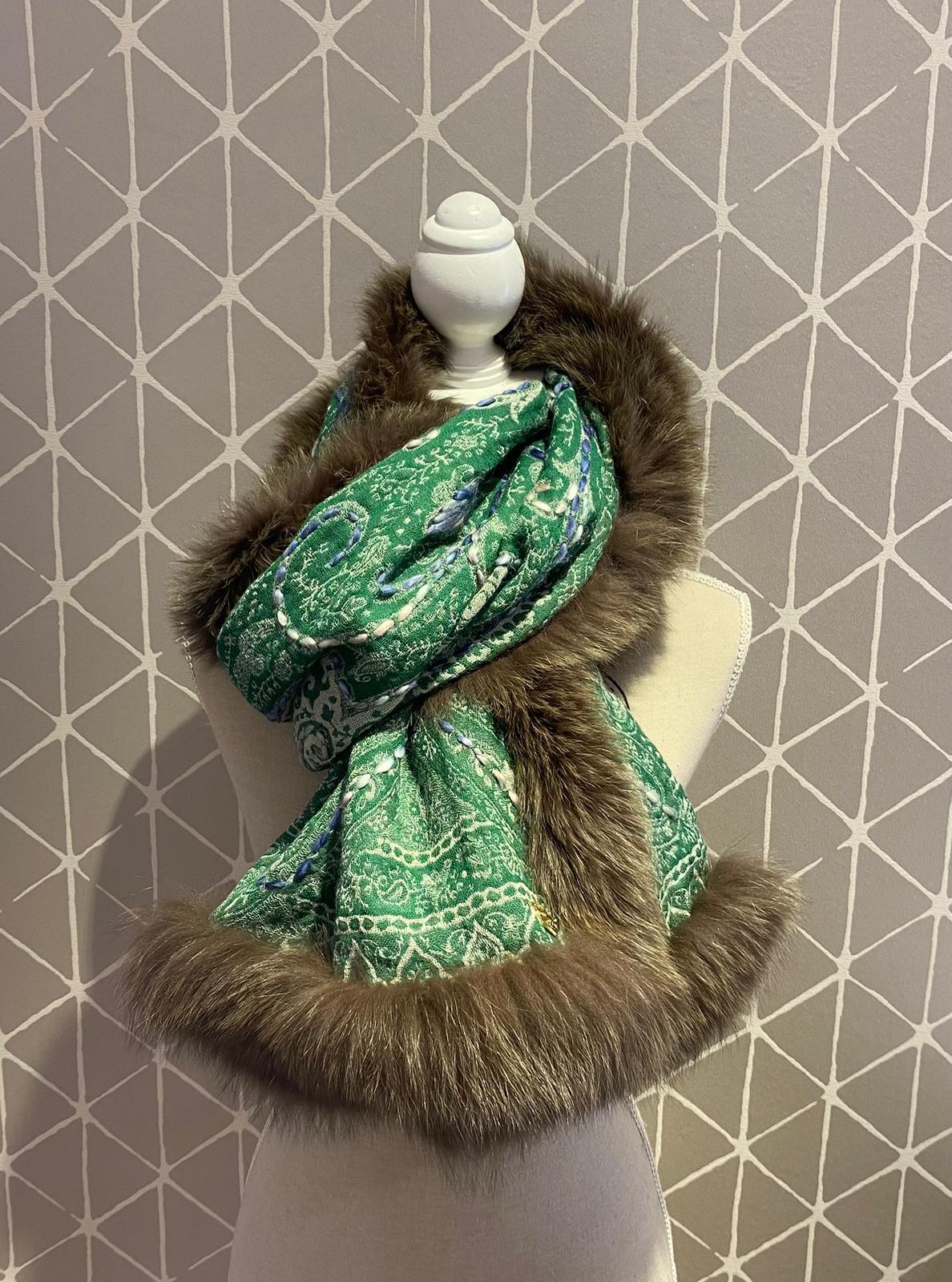 Bufanda cashmere estampado paisley verde ribeteada en pelo natural marrón
