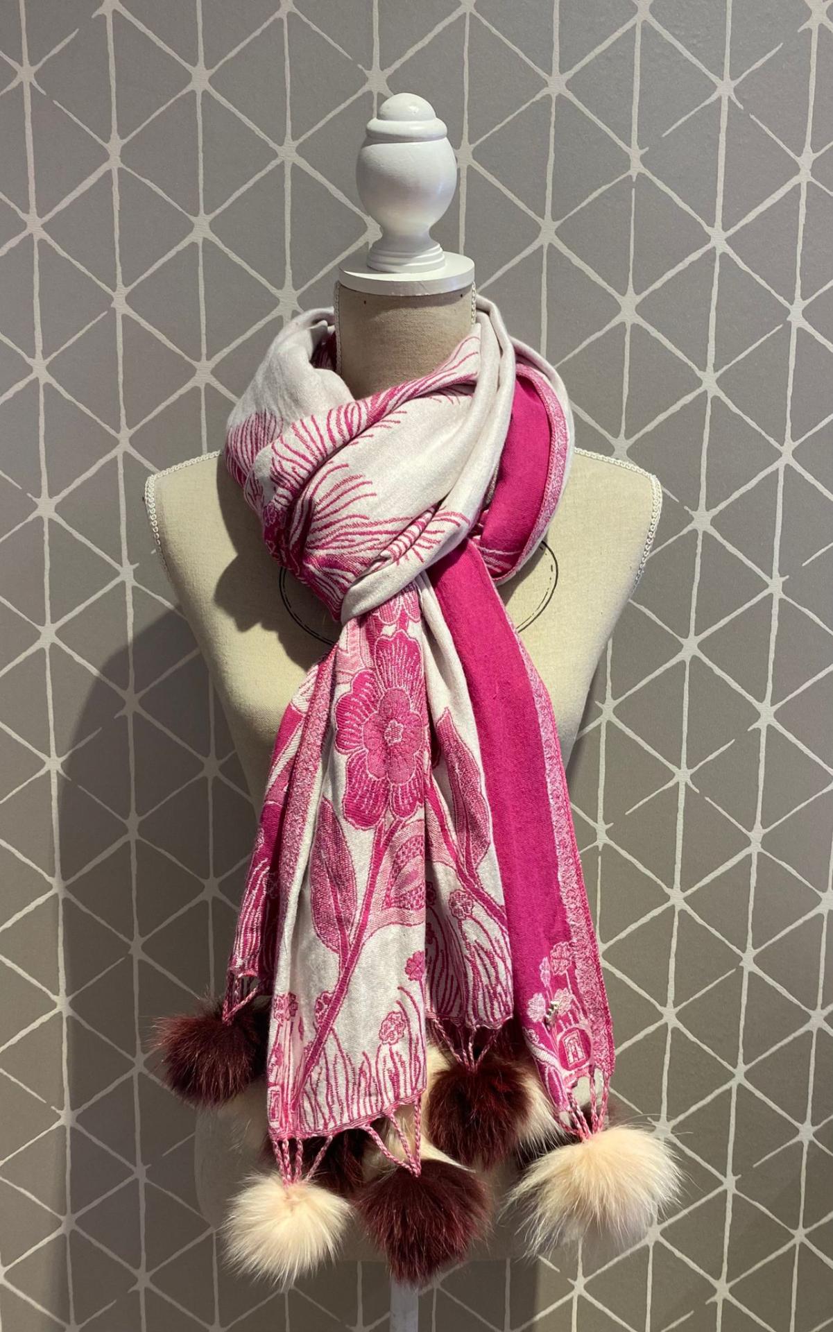 Bufanda pashmina de cashmere en tonos rosa y blanco con estampado floral.