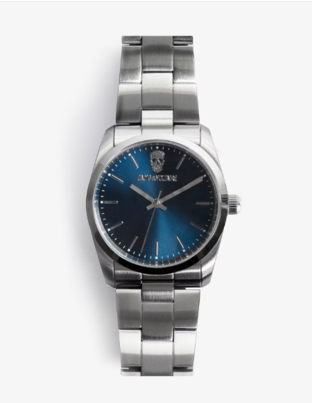 Como este reloj de acero inoxidable con esfera azul marino y patrón de calavera mini y logo de Zadig & Voltarie en la parte superior.