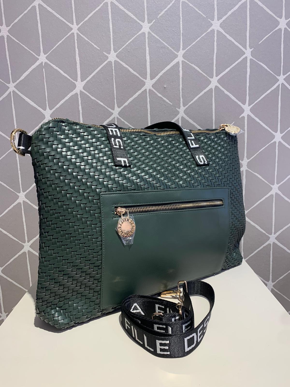 Como este bolso de tamaño grande, tipo maletín de mano, realizado en original ecopiel tranzada de color negro. Un bolso todoterreno con gran capacidad para todo lo que necesitas en tu día a día. Cuenta con cremallera superior para darle un plus de seguridad y asas cortas, que te permitirán llevarlo al brazo o en la mano cómodamente. Asimismo incluye una correa regulable y extraíble con el que podrás llevar el bolso al hombro tipo bandolera para ganar comodidad. El interior está forrado y tiene varios compartimentos para guardar tus documentos y objetos personales. Además cuenta con un bolsillo exterior en la parte frontal, también con cremallera con el nombre de la marca, para darle ese toque que La Fille confiere a todos sus artículos.