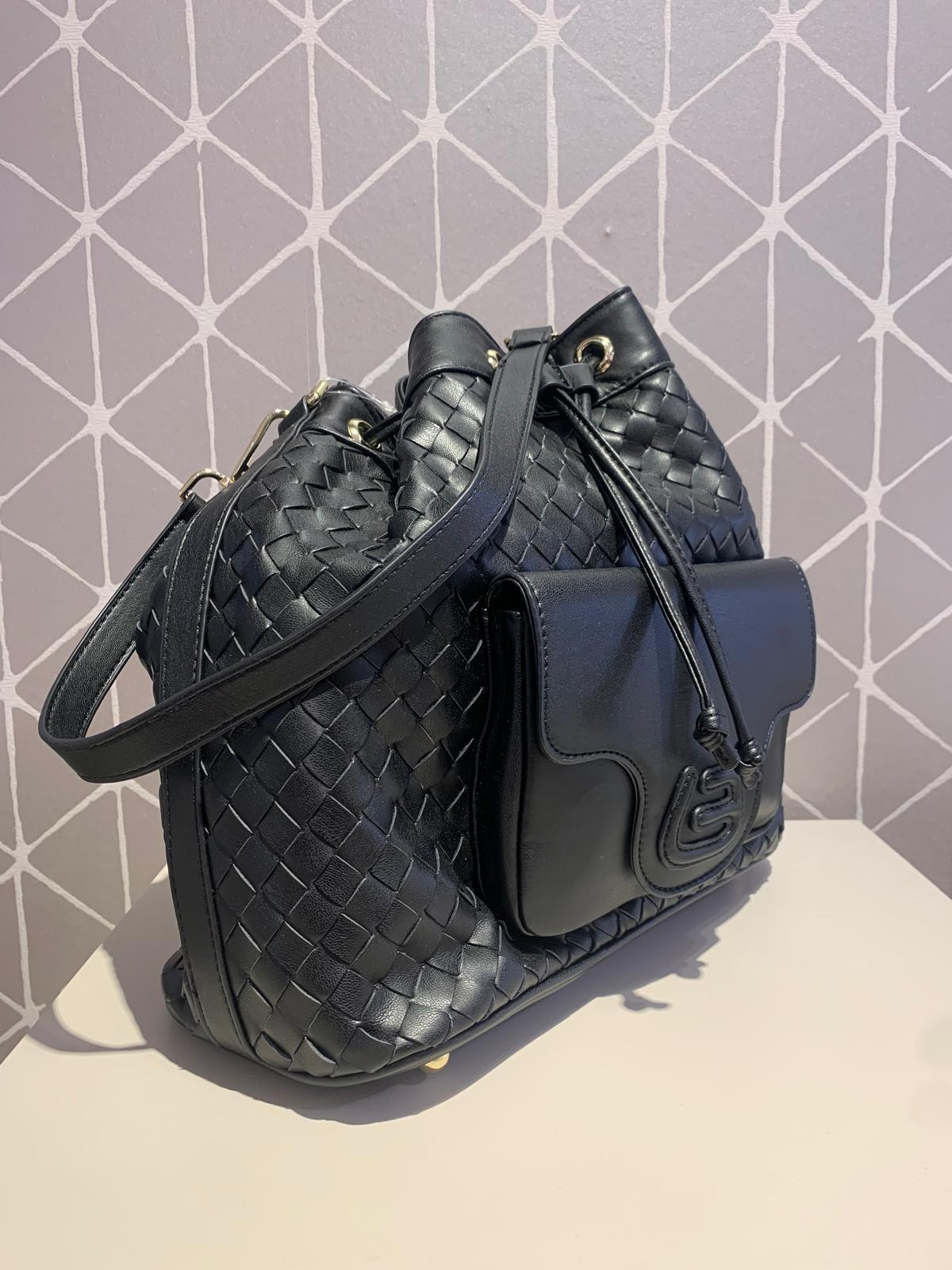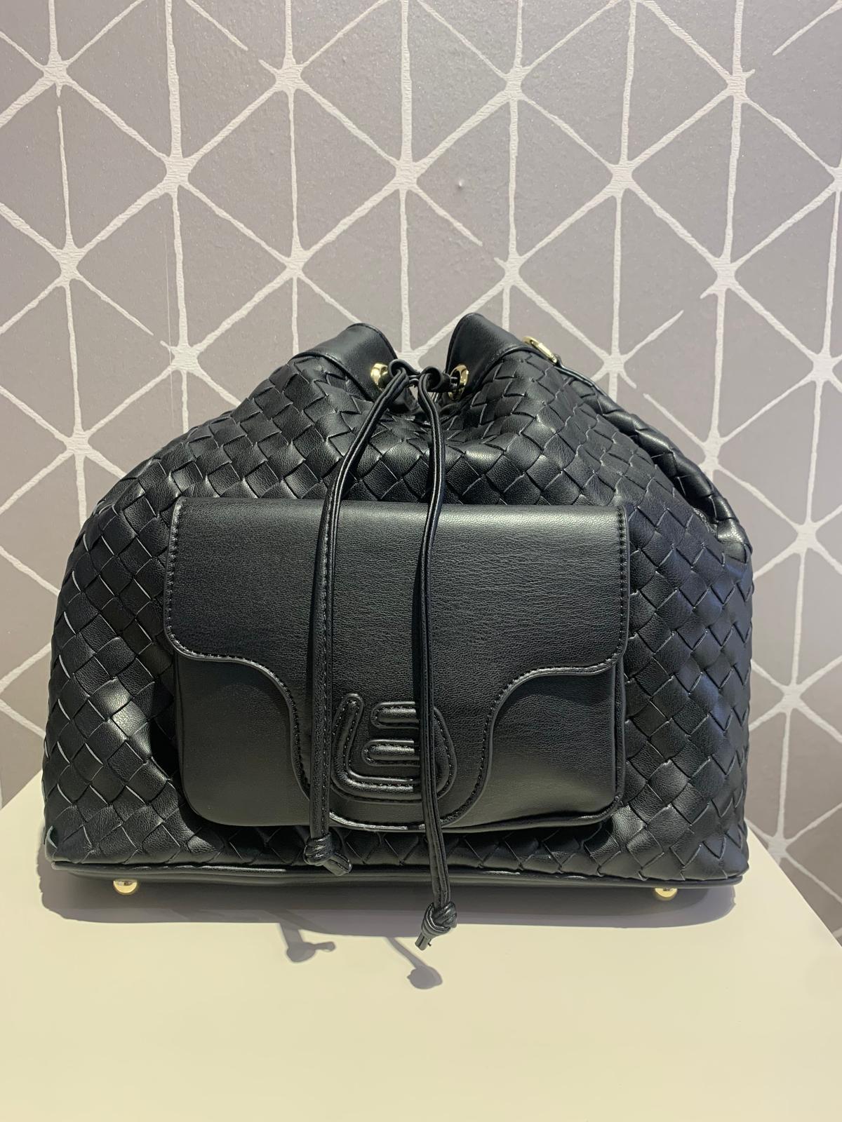 Como este bolso tipo bombonera en tamaño grande, realizado en original ecopiel tranzada de color negro. Un bolso todoterreno con gran capacidad para todo lo que necesitas en tu día a día. Cuenta con cierre superior con cordón para fruncir y correa corta, que te permitirán llevarlo al brazo o en la mano cómodamente. Asimismo incluye una correa regulable más larga con la que podrás llevar el bolso al hombro a modo de bandolera para ganar comodidad. El interior está forrado y tiene varios compartimentos para guardar tus documentos y objetos personales. Además cuenta con un bolsillo exterior en la parte frontal, con solapa con el logo de la marca, para darle ese toque que La Fille confiere a todos sus artículos.