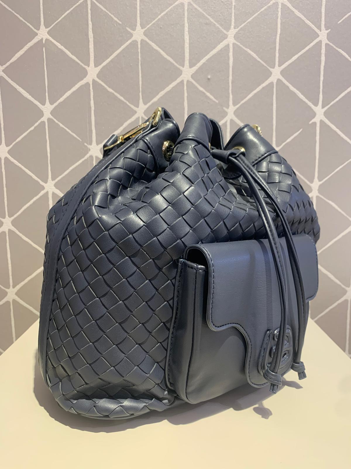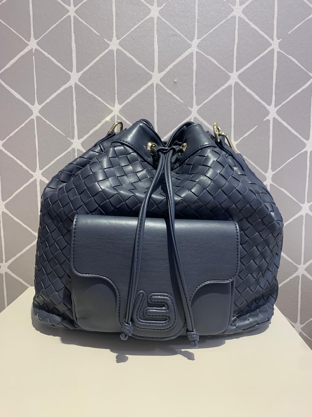 Como este bolso tipo bombonera en tamaño grande, realizado en original ecopiel tranzada de color azul marino. Un bolso todoterreno con gran capacidad para todo lo que necesitas en tu día a día. Cuenta con cierre superior con cordón para fruncir y correa corta, que te permitirán llevarlo al brazo o en la mano cómodamente. Asimismo incluye una correa regulable más larga con la que podrás llevar el bolso al hombro a modo de bandolera para ganar comodidad. El interior está forrado y tiene varios compartimentos para guardar tus documentos y objetos personales. Además cuenta con un bolsillo exterior en la parte frontal, con solapa con el logo de la marca, para darle ese toque que La Fille confiere a todos sus artículos.