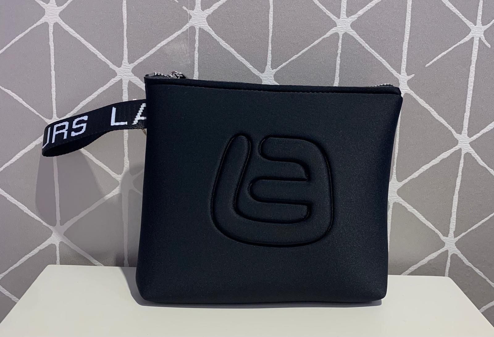 Al igual que todos los productos de esta firma italiana, los acabados están cuidados con mucho mimo. El neceser cuenta con una correa lateral corta, de nylon negro con el nombre de la firma en color blanco, que permite llevarlo cómodamente en la muñeca y usarlo como cartera de mano. Y cuenta con cierre de cremallera.