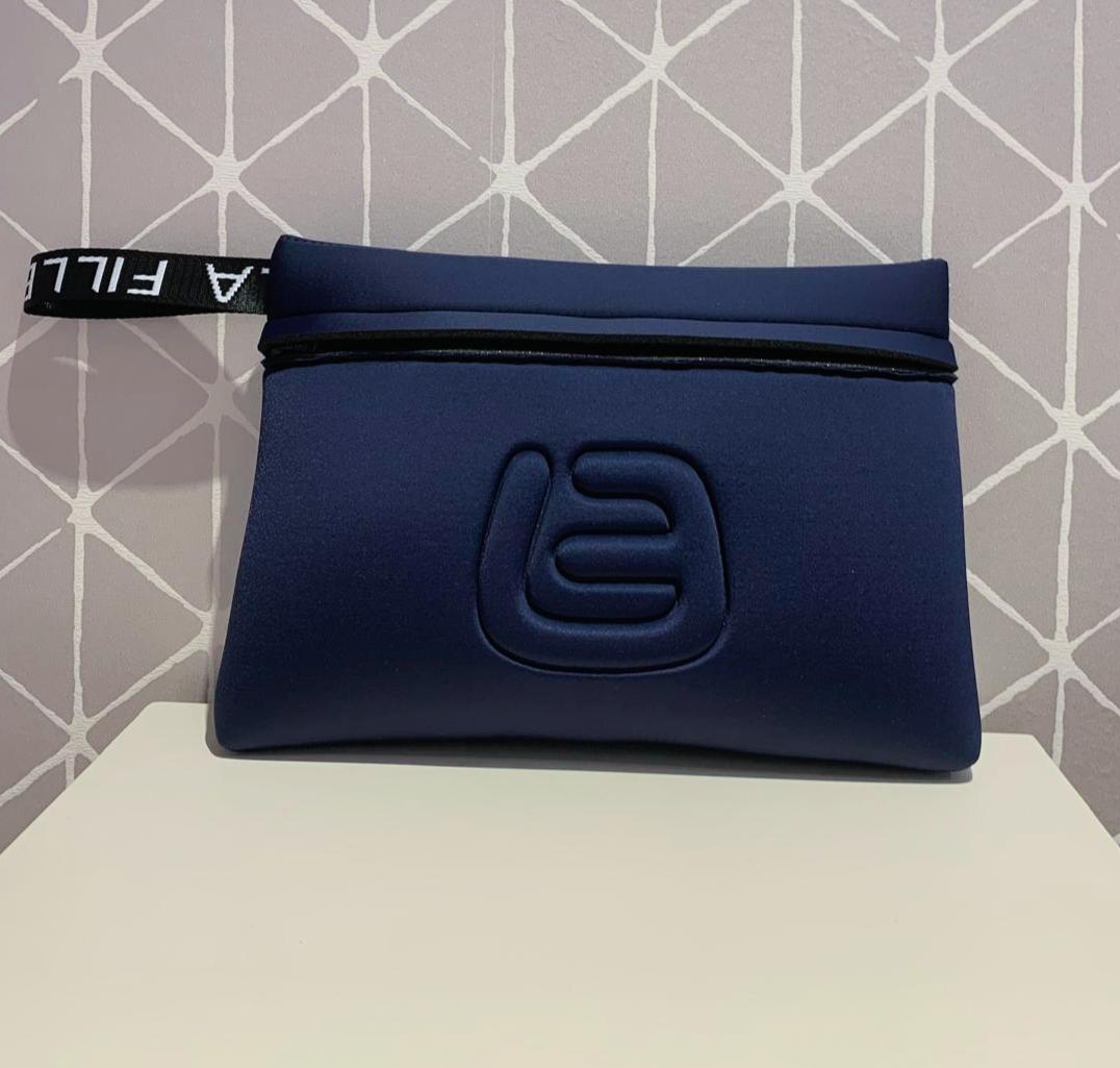Al igual que todos los productos de esta firma italiana, los acabados están cuidados con mucho mimo. El neceser cuenta con una correa lateral corta, de nylon negro con el nombre de la firma en color blanco, que permite llevarlo cómodamente en la muñeca y usarlo como cartera de mano. Y cuenta con cierre de cremallera en la zona frontal con una pequeña solapa.