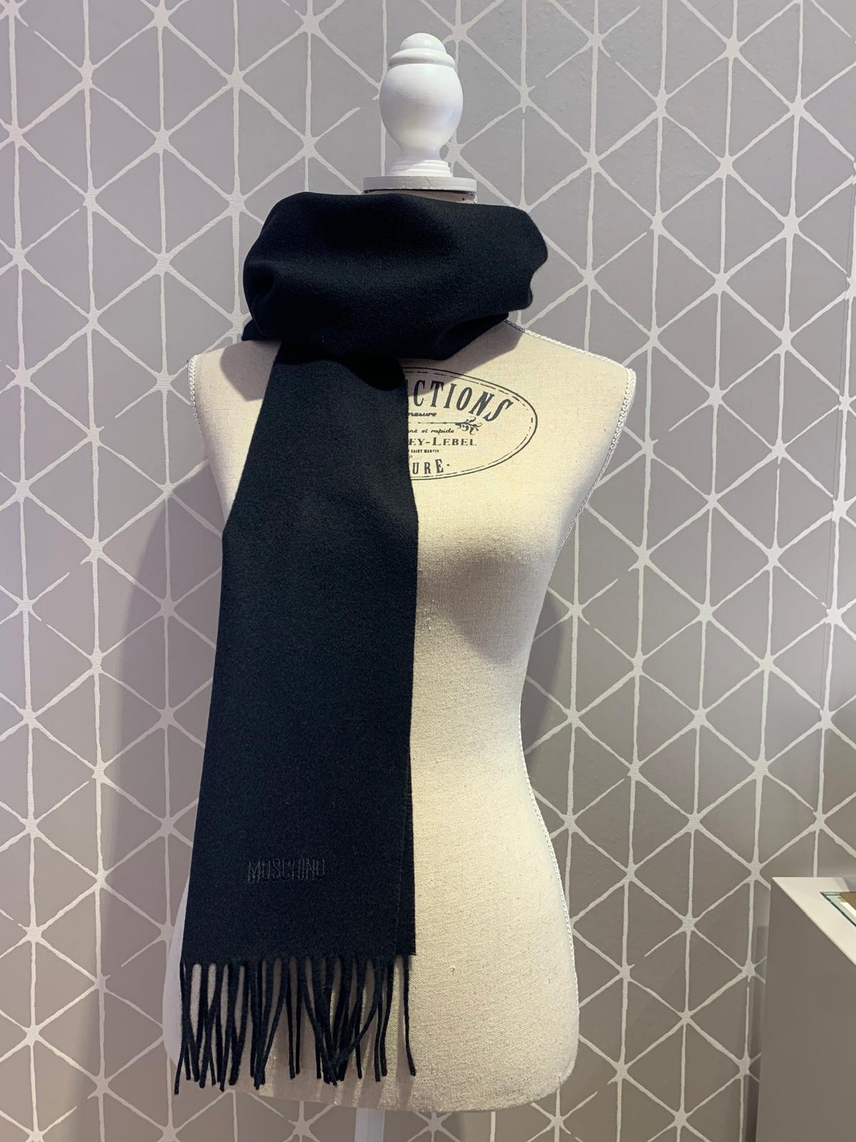 Como es el caso de esta bufanda, todo un clásico de la firma, realizada en lana merina 100% en tono negro con detalle del logo de "MOSCHINO" en uno de los extremos inferiores bordado en un gris ligeramente más oscuro. La bufanda, muy agradable y cálida, está rematada en flecos.