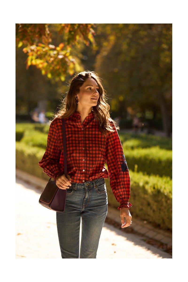 Como esta camisa con estampado de cuadros vichi en tonos naranja y granate y bordados de hilo en las mangas. Su cuello mao fruncido y las mangas abullonadas con puños elásticos le dan un aire romántico y sofisticado. Perfecta para crear looks casuales con un toque artesanal y femenino