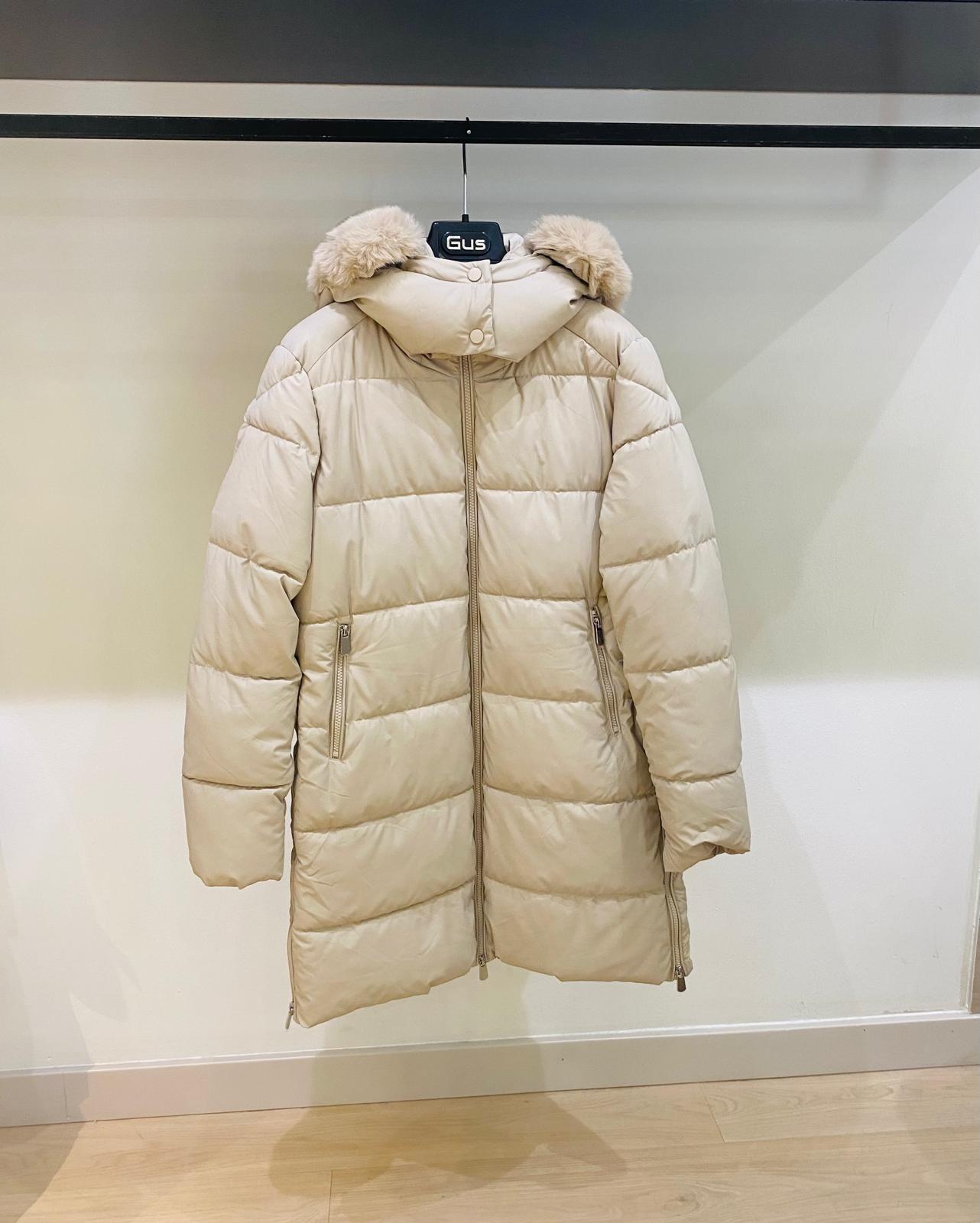 Como esta parka de la nueva colección de Gus de tejido acolchado guateado tipo ecopiel con acabado encerado y largura tres cuartos, en color beige clarito. TIene capucha para protegerte del frío y la lluvia, con detalle de pelito corto alrededor. Cierre central de cremallera y bolsillos con cremalleras en los laterales. Un abrigo todoterreno, que combina con cualquier look y que se convertirá en tu favorito en estos meses más fríos.