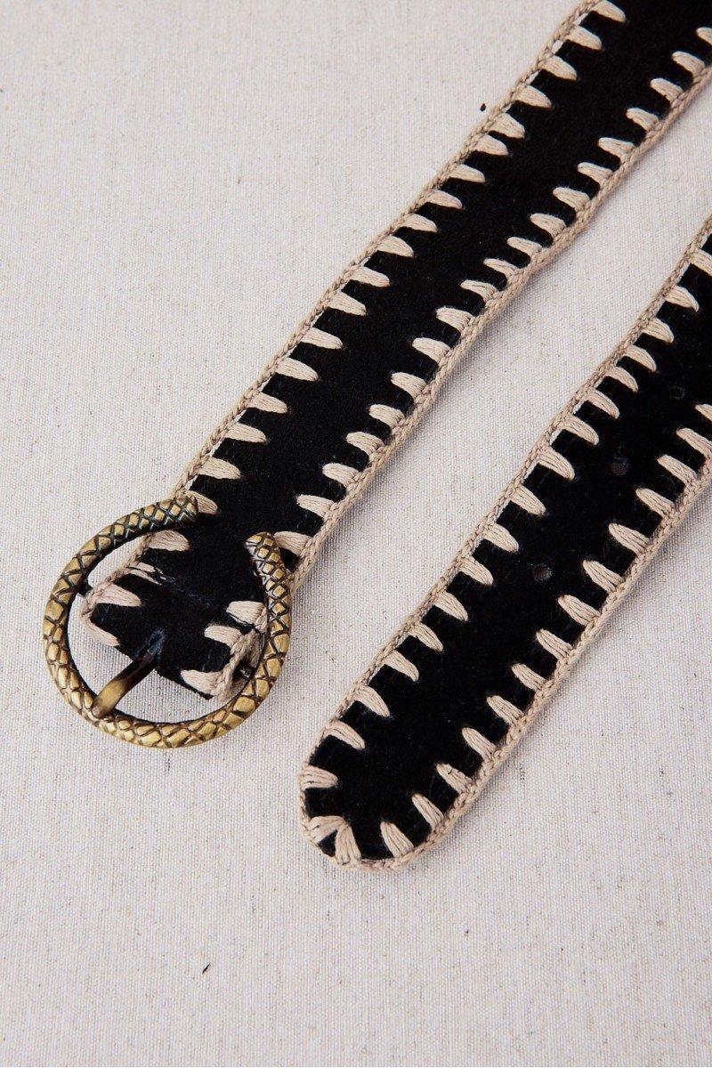 Como este cinturón de inspiración artesanal y esencia bohemia, realizado en ante de color negro con pespunte de hilo a contraste y hebilla envejecida es perfecto para marcar la cintura con personalidad.