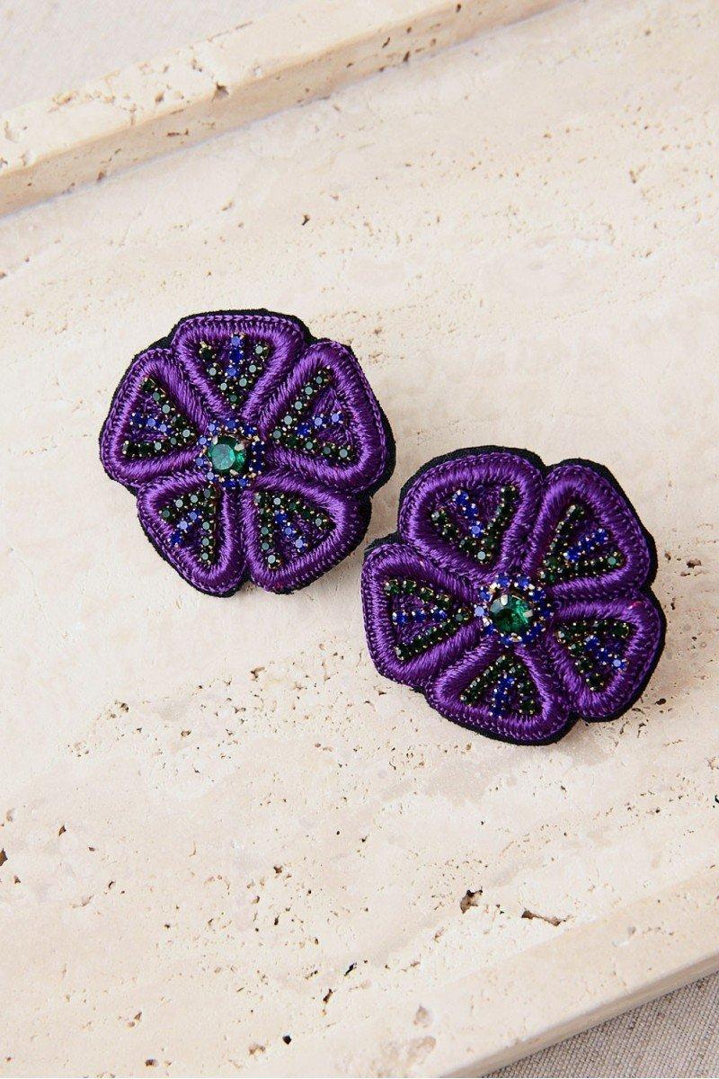 Como estos originales pendientes con forma de flor en color morado elaborados a mano con estructura de hilo y tejido, decorados con cristales que resaltan el diseño bordado. Un complemento ligero, llamativo y lleno de color que aporta un toque artesanal y alegre a cualquier look. Combínalos con los broches a juego o con otras piezas de la colección de Latido.