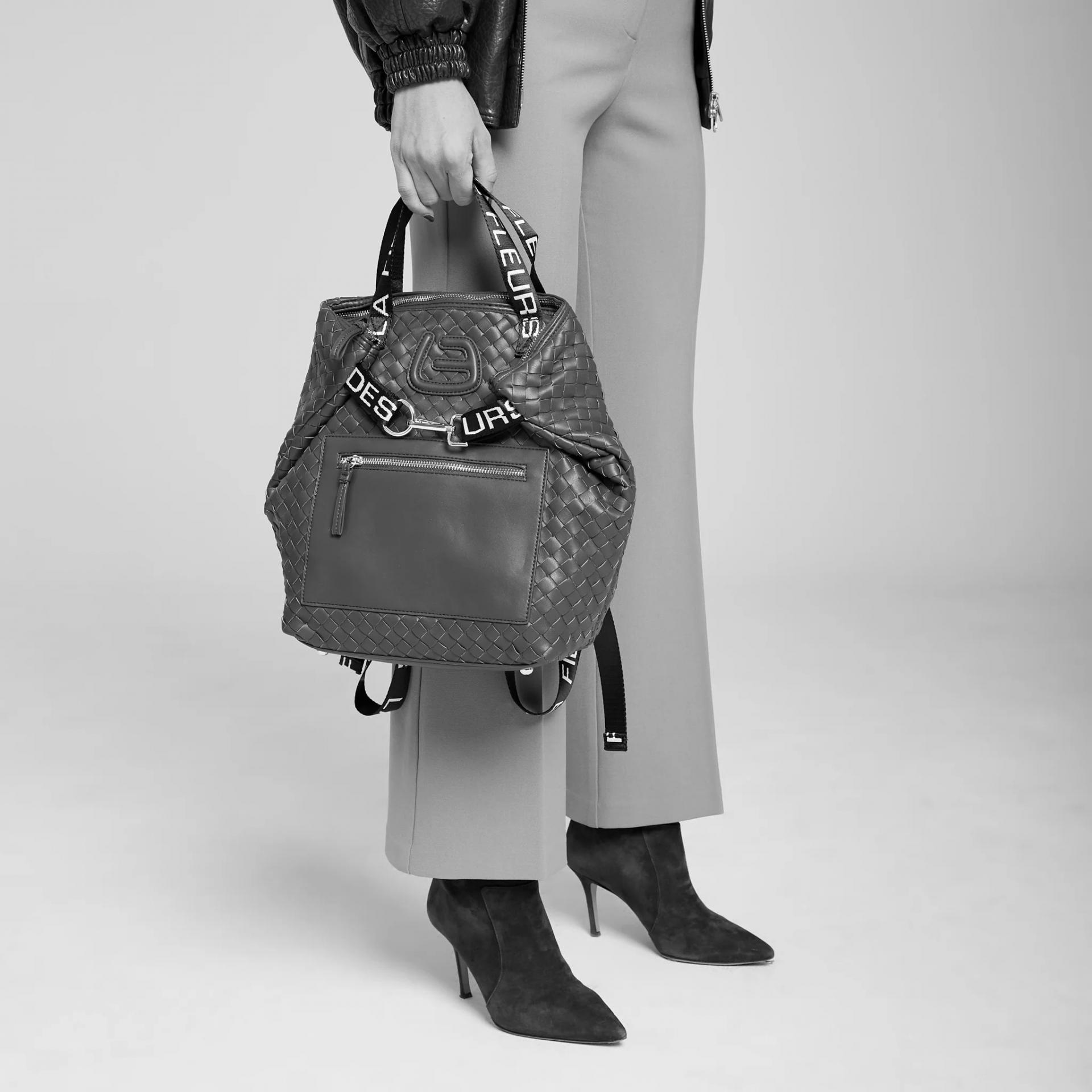 Este bolso mochila de La Fille des Fleures está fabricado en ecopiel de color beige con un original formato trenzado, con cierre de cremallera, para que puedas llevar tus objetos contigo con seguridad. Una mochila muy cómoda y resistente que garantiza una versatilidad única para viajes, trabajo y ocio. Tiene un bolsillo delantero con cremallera, muy práctico para guardar objetos de uso frecuente, y tiene un mosquetón en el lateral que permite reducir el tamaño de la mochila para lucirla con mayor comodidad.
