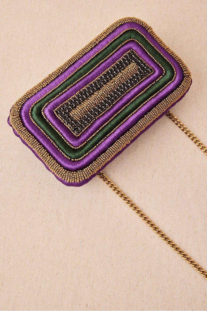 Como este original clutch ideal para un evento especial, ribeteado en hilo en tonos verde y morado berenjena con detalles de cuentas en color dorado y cristalitos negros en la zona central. Un bolso de mano con un diseño muy original que combinará con tus looks más especiales. Además, incluye cadenita dorada para poder lucirlo al hombro tipo bandolera con un plus de comodidad.