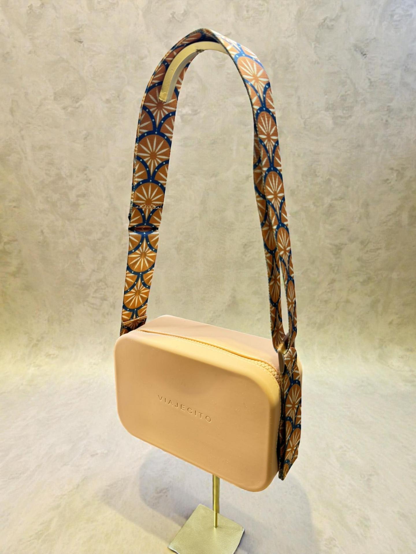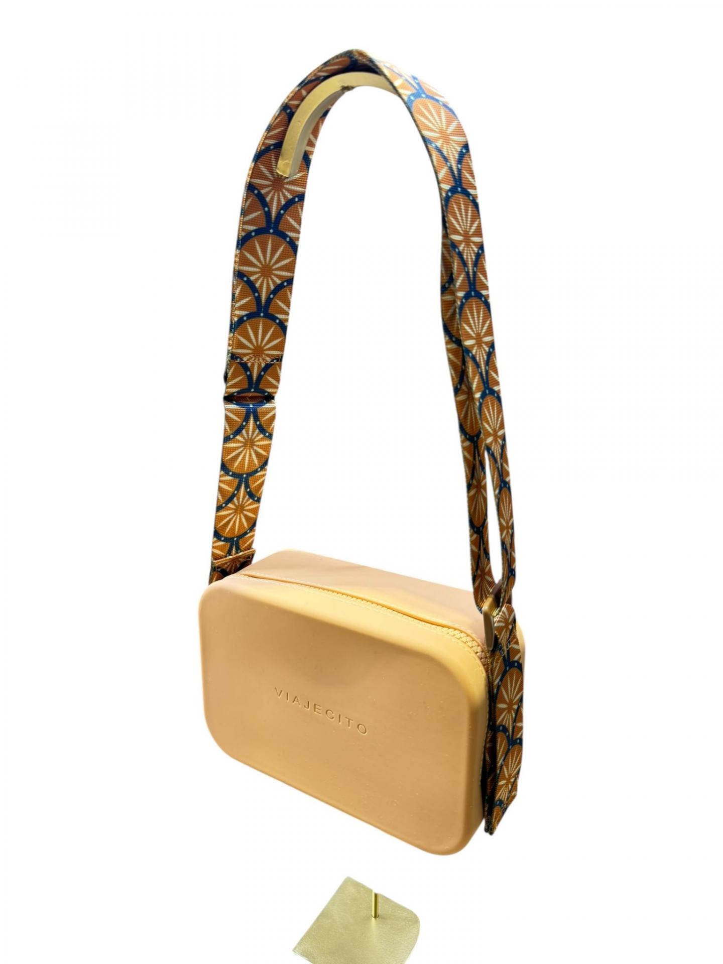 Bolsos muy versátiles como este modelo en formato bandolera en color marrón toffee, con cierre de cremallera al tono y correa de estampado geométrico en tonos azulón y tostado dorado. El interior está forrado en tejido de algodón e incluye un bolsillito.