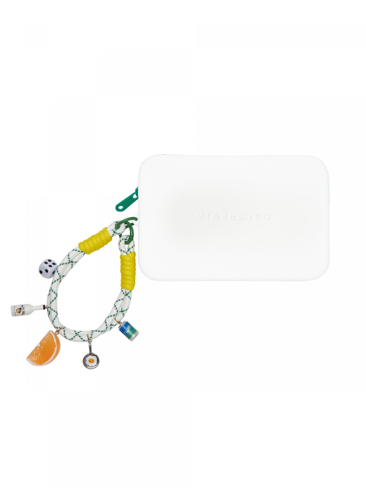 Complementos muy versátiles como esta original cartera en color blanco, con cierre de cremallera en color verde y correa en formato cordón de colores, en el lateral, para llevarla con mayor comodidad y darle un toque diferente y divertido. La correa está decorada con originales charms de vivos colores que la hacen única.