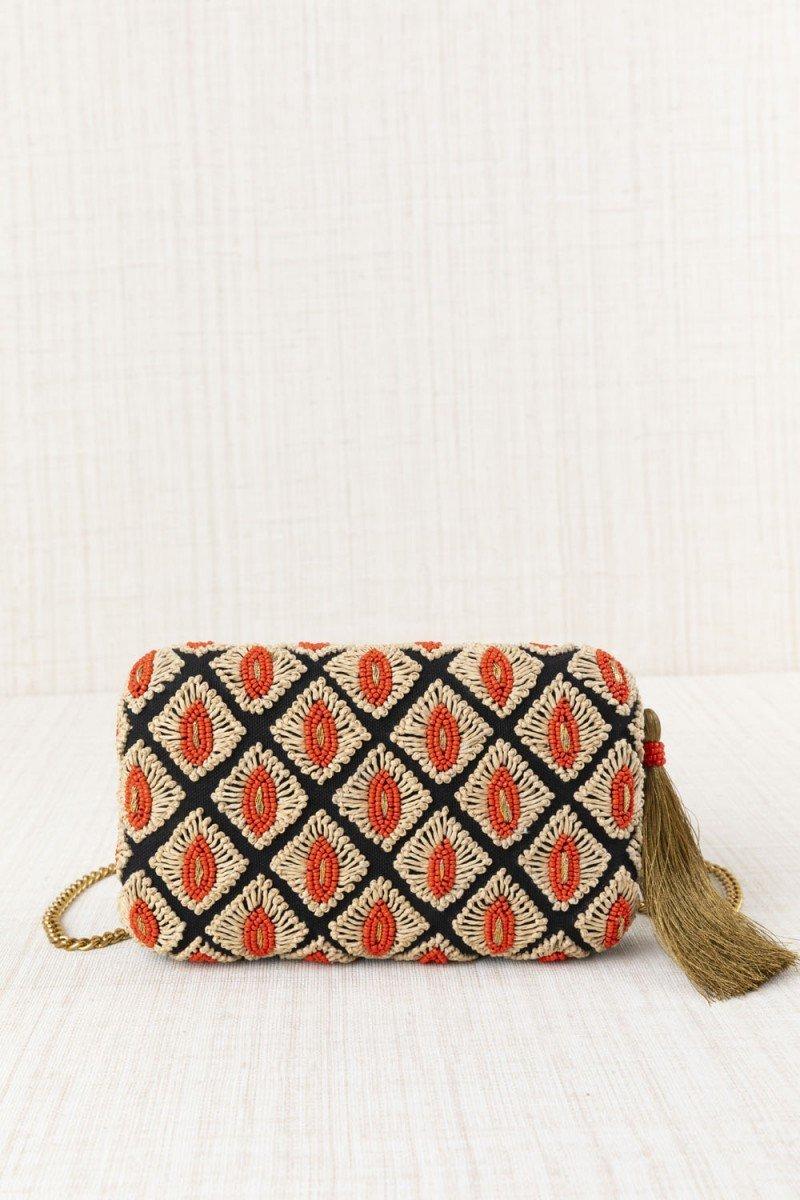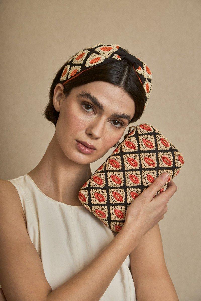 Como este original clutch ideal para un evento especial, con fondo en tono negro y decorado con un original dibujo de rombos con bordado de rafia y mini cuentas en tono coral. Un divertido diseño que combina texturas y materiales aportando un acabado sofisticado y distintivo, perfecto para complementar tus looks más especiales. Además, incluye cadenita dorada para poder lucirlo al hombro tipo bandolera con un plus de comodidad.