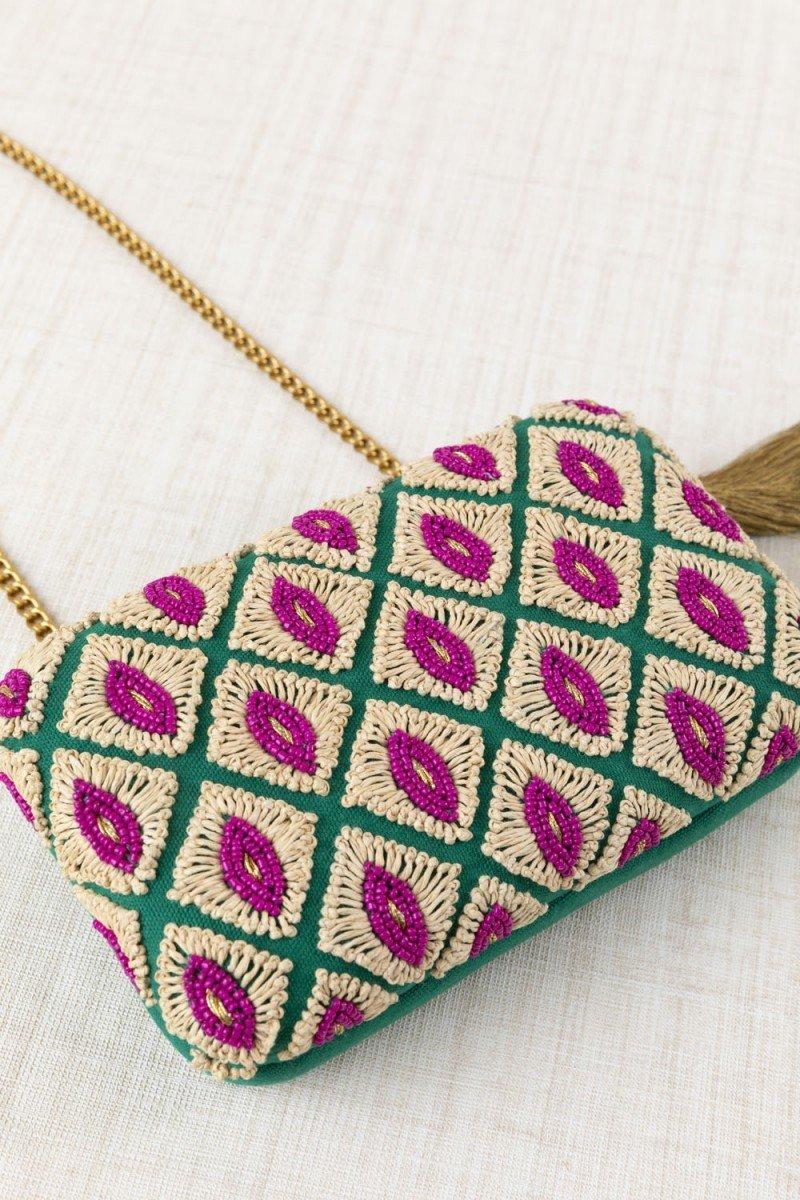 Bolso fiesta Latido verde rafia y cuentas fucsia