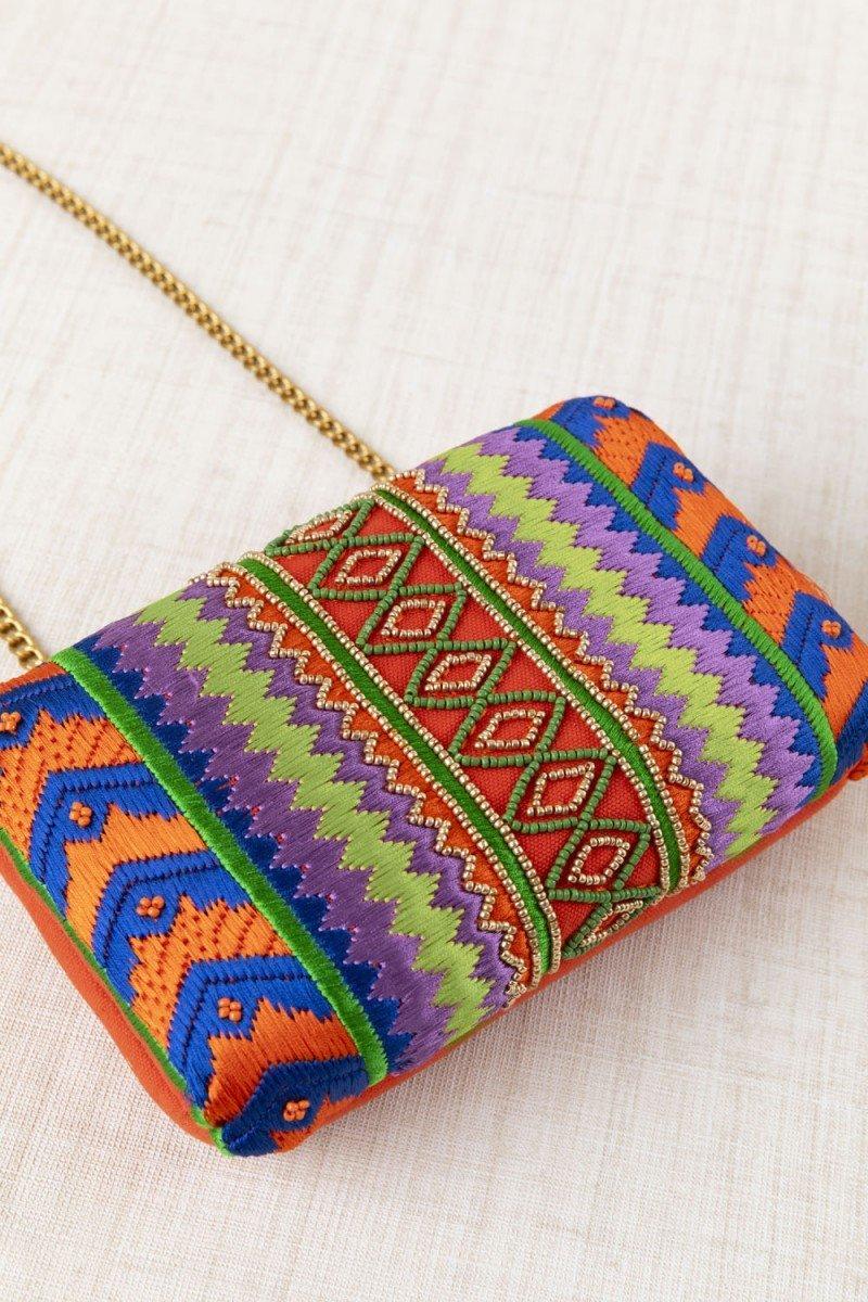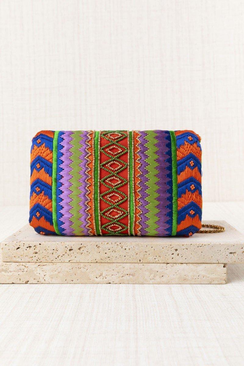 Como este original clutch ideal para un evento especial, decorado con un original bordado con motivos étnicos en tonos naranjas, azules, verdes y lilas y una greca centra de pequeñas cuentas en tonos verdes y dorados. Un bolso de mano con un diseño muy original que combinará con tus looks más especiales. Además, incluye cadenita dorada para poder lucirlo al hombro tipo bandolera con un plus de comodidad.
