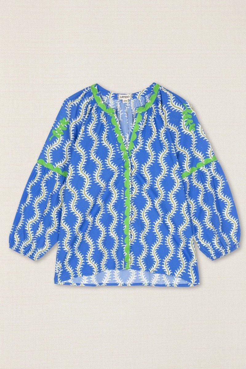 Como esta camisa en tono azul y blanco, confeccionada en viscosa ligera, que destaca por sus bordados de hilo verde en hombros, cuello y mangas, que aportan textura y carácter. El cuello mao y los puños fruncidos enmarcan un diseño elegante y versátil, ideal para elevar un outfit de día o de noche.