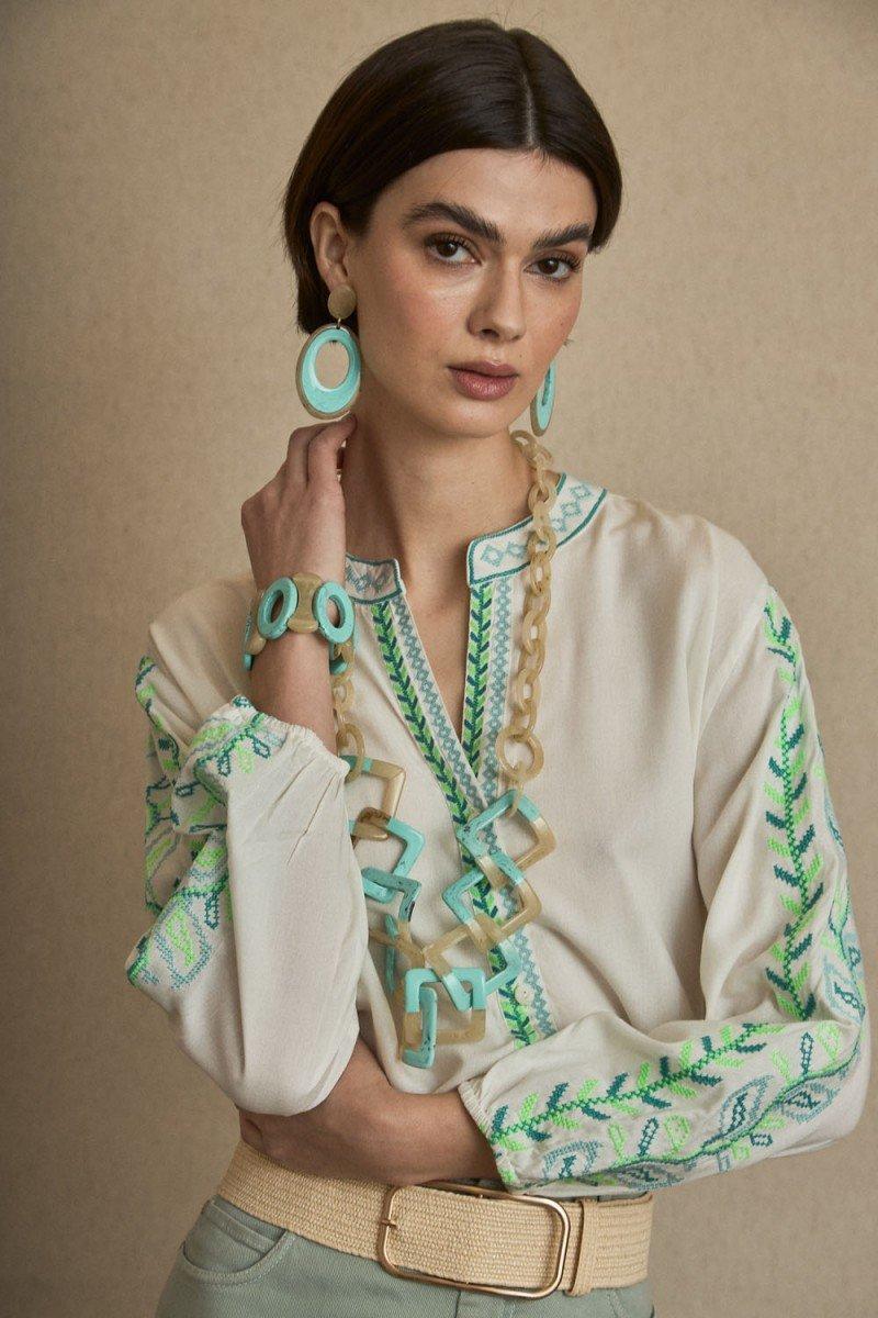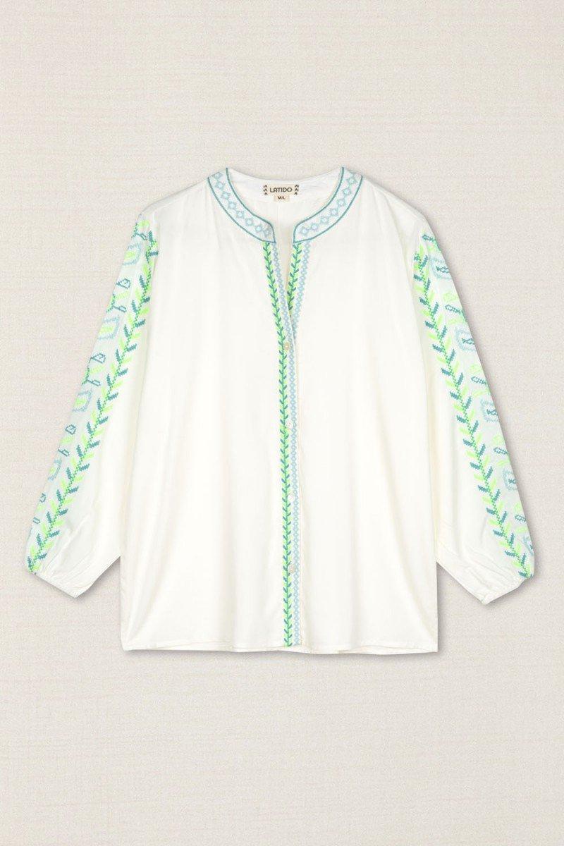 Como esta camisa en tono blanco, confeccionada en viscosa ligera, que destaca por sus delicados bordados de hilo con forma de hojas en colores turquesa, y lima flúor, tanto en las mangas como en el frontal y el cuello. Un detalle que aporta textura y carácter. El cuello mao y los puños fruncidos enmarcan un diseño elegante y versátil, ideal para elevar un outfit de día o de noche.