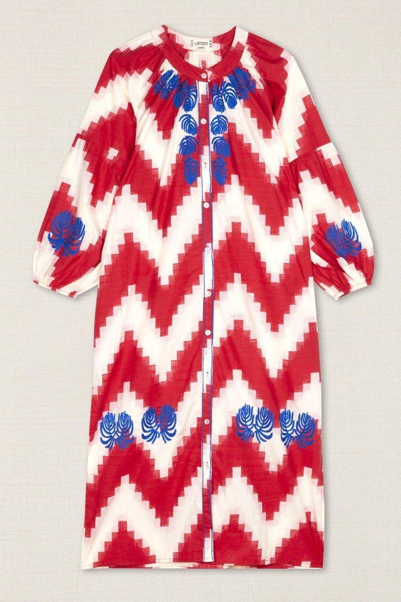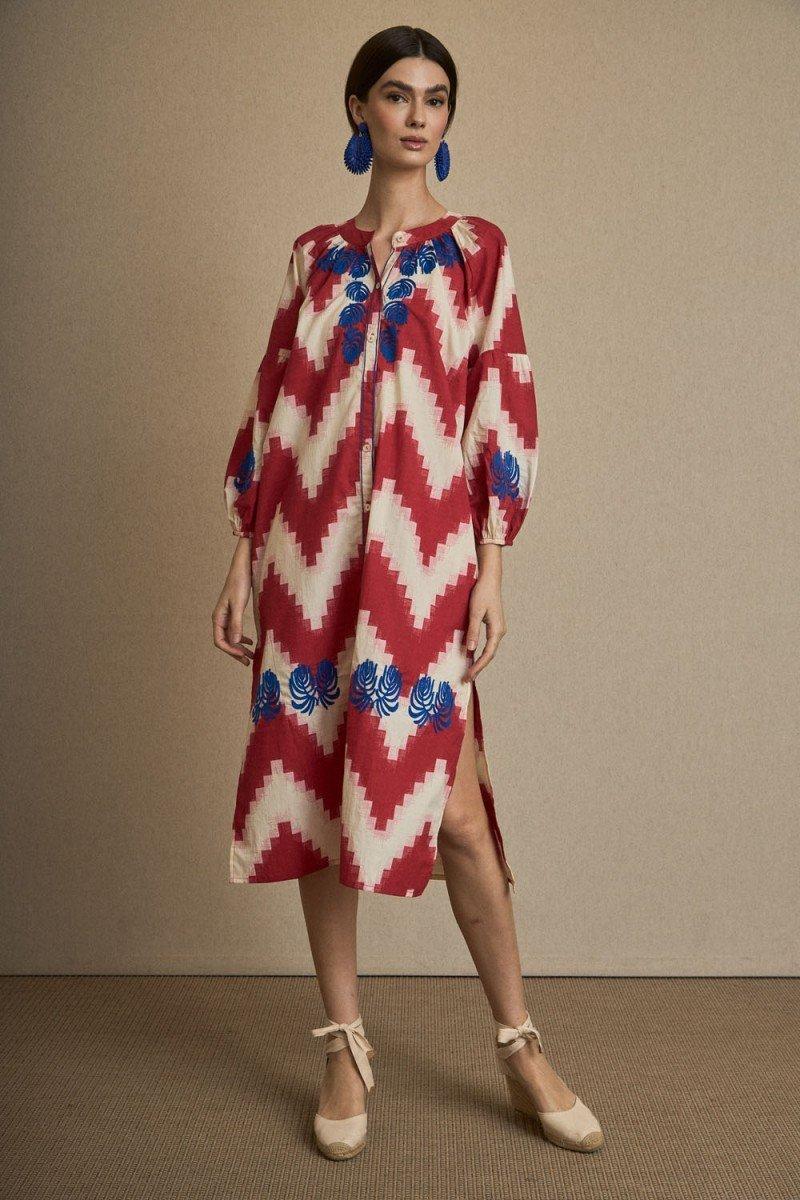 Como este vestido confeccionado en viscosa ligera, en el que destacan sus bordados de hilo en hombros y mangas, que aportan textura y carácter. El cuello mao y los puños fruncidos enmarcan un diseño elegante y versátil, ideal para elevar un outfit de día o de noche.- Cierre con botones.