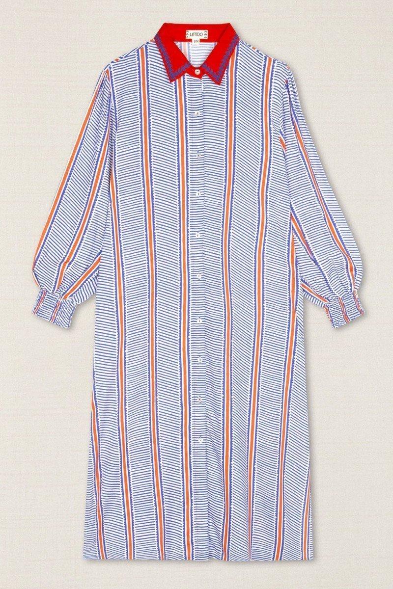 Como este vestido confeccionado en un tejido ligero y fluido, un vestido camisero que destaca por su elegante estampado de rayas verticales en tonos azul y coral, que estilizan la silueta. Su diseño de corte midi, con cuello clásico y botonadura frontal, aporta un aire sofisticado y versátil, ideal para looks de día con un toque refinado o para ocasiones más especiales.