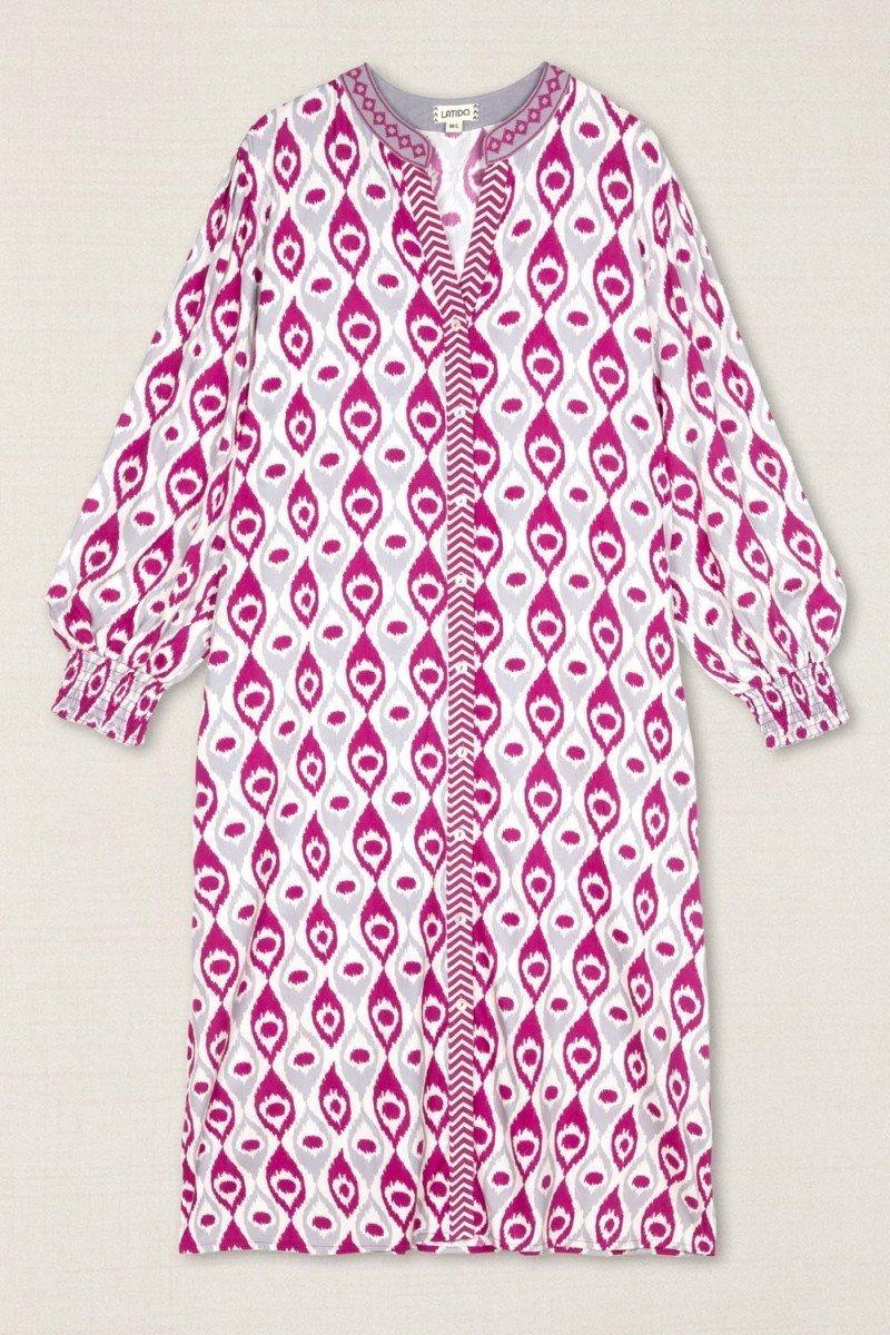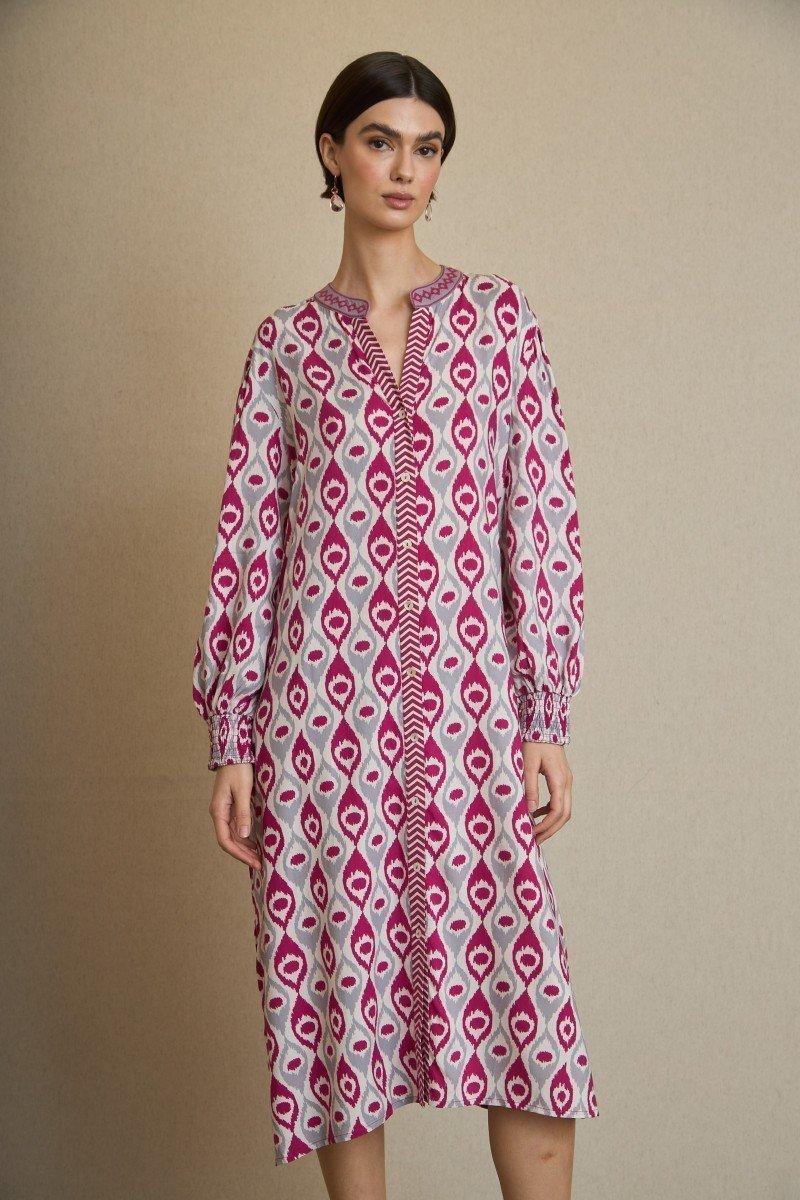Como este vestido confeccionado en viscosa ligera, en el que destaca su estampado geométrico con amebas en tonos rosa fucsia y gris, que aporta carácter a esta versátil prenda. El cuello mao y los puños fruncidos enmarcan un diseño elegante y ligero, ideal para elevar un outfit de día o de noche.- Cierre con botones.