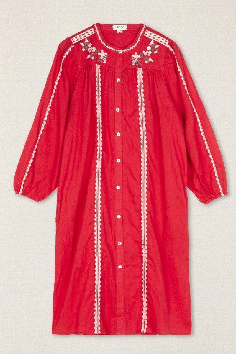 Como este vestido confeccionado en viscosa ligera, en un intenso color rojo, en el que destacan sus bordados de hilo blanco tanto en mangas como en el frontal y el cuello, que aportan textura y carácter a esta prenda. El cuello mao y los puños fruncidos enmarcan un diseño elegante y versátil, ideal para elevar un outfit de día o de noche. Cierre con botones. Combínalo con otros complementos de la firma y crea un total look Latido único.