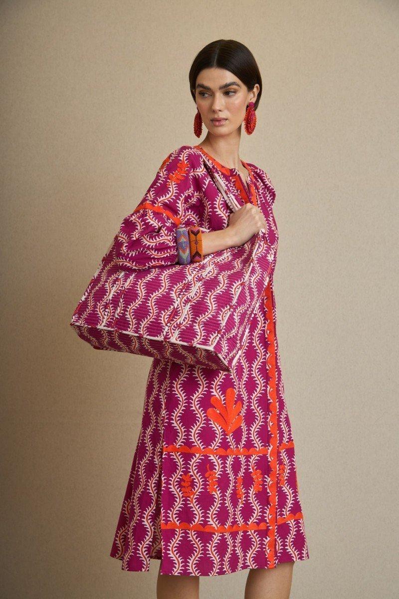 Vestido ondas buganvilla con bordados naranjas