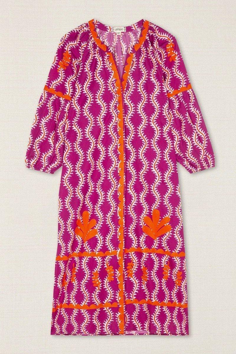 Como este vestido confeccionado en viscosa ligera, en el que destacan su diseño geométrico con ondas verticales en tonos buganvilla y sus bordados de hilo en color naranja tanto en mangas como en el frontal, la botonadura y el cuello, que aportan textura y carácter a esta prenda. El cuello mao y los puños fruncidos enmarcan un diseño elegante y versátil, ideal para elevar un outfit de día o de noche. Cierre con botones. Combínalo con otros complementos de la firma y crea un total look Latido único.