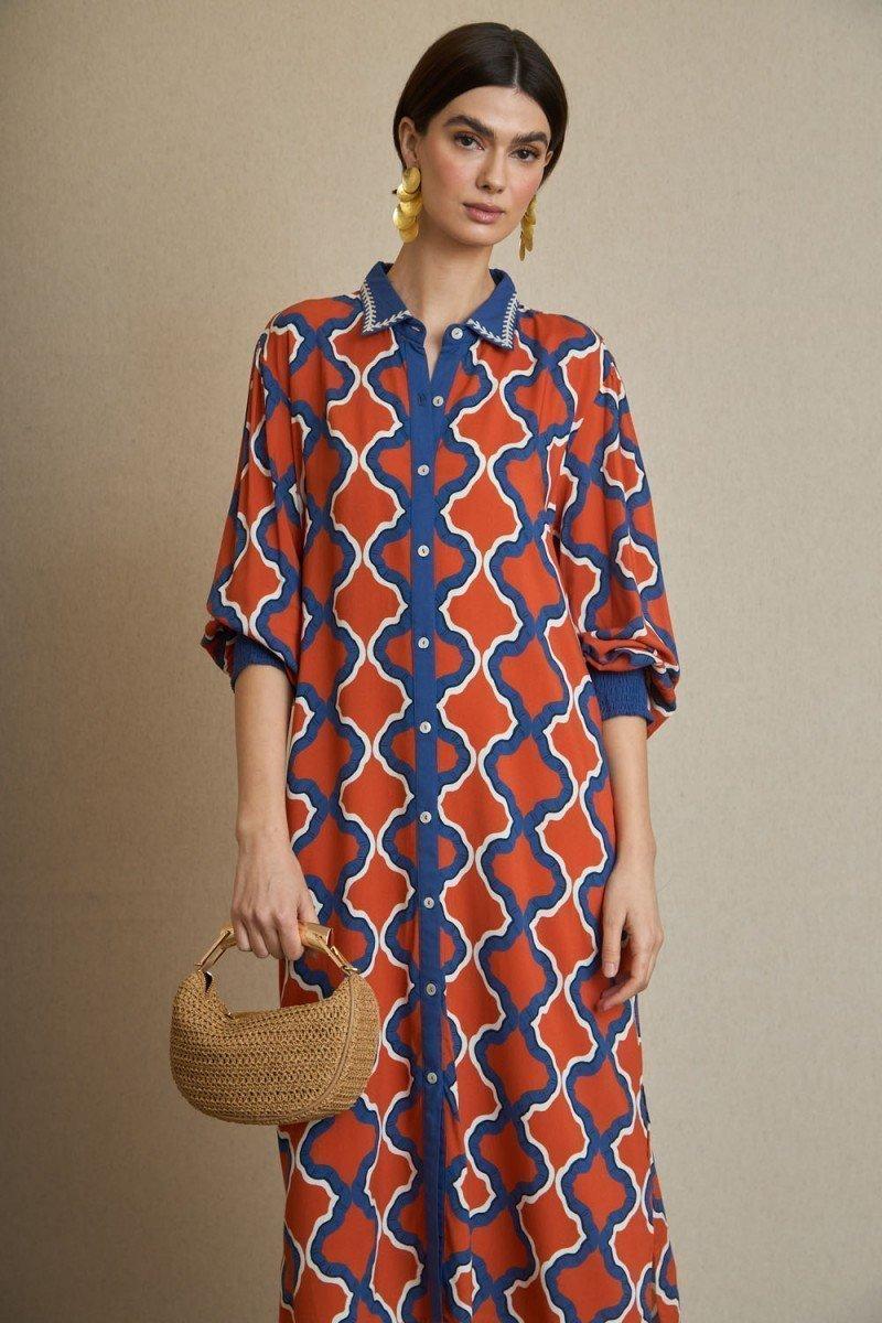Como este vestido confeccionado en un tejido ligero y fluido, un este vestido camisero que destaca por su elegante estampado geométrico de diseño único en tonos anaranjado y azulón. Su diseño de corte midi, con cuello clásico y botonadura frontal, aporta un aire sofisticado y versátil, ideal para looks de día con un toque refinado o para ocasiones más especiales.