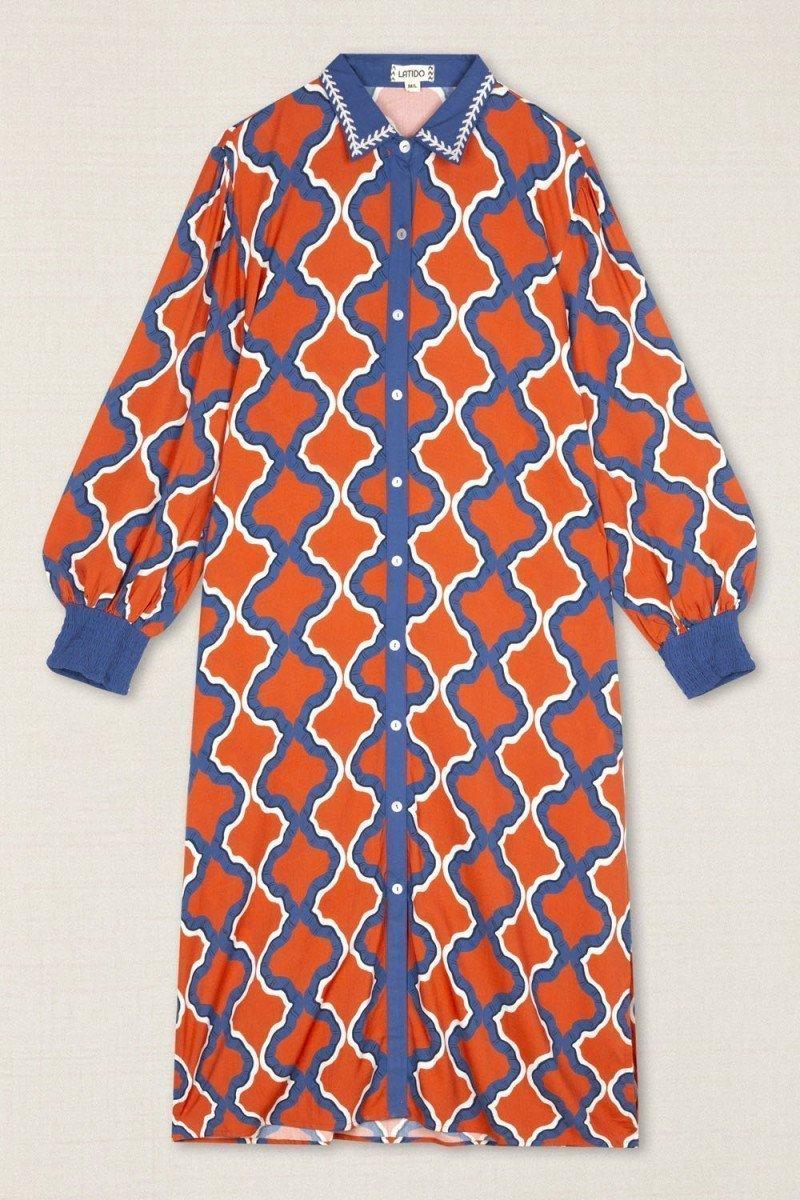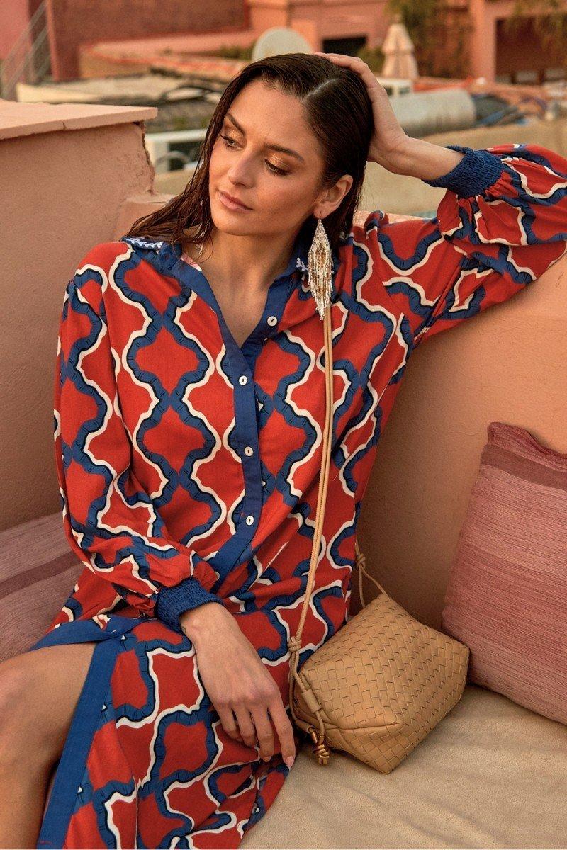 Vestido camisero geométrico naranja y azul