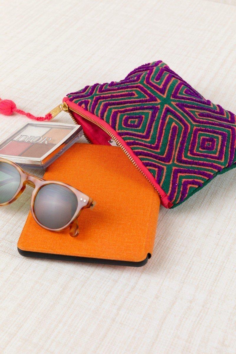 Como este neceser o bolsito de mano en tamaño mediano con un original diseño geométrico bordado en relieve y colores vibrantes, morados, verdes o rosa flúor, ideal para dar un toque diferente y sofisticado a cualquier look. Práctico y versátil, cuenta con cierre de cremallera decorado con un borlón de hilo en tono rosa.