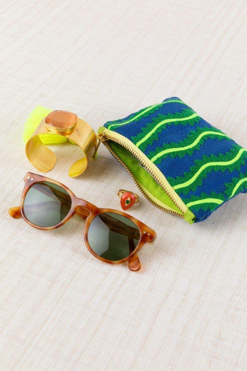 Como este neceser o bolsito de mano en tamaño pequeño con un original diseño geométrico de ondas bordado en relieve y colores vibrantes, en azulón, verde y amarillo flúor, ideal para dar un toque diferente y sofisticado a cualquier look. Práctico y versátil, cuenta con cierre de cremallera decorado con borlón de hilo en amarillo flúor.