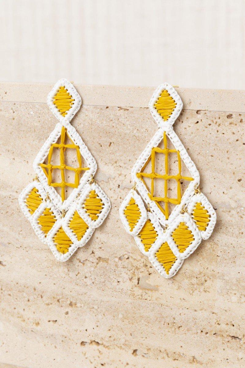 Como estos originales pendientes de rafia y tejido con diseño geométrico de rombos, en colores amarillos y blanco, ideales para aportar un toque artesanal y sofisticado. Su formato largo y muy ligero los convierte en el complemento perfecto para looks de día y de verano.