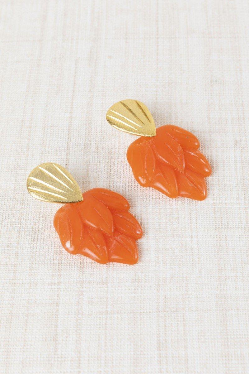 Como estos originales pendientes con diseño de hojas elaboradas en resina en tono coral anaranjado y detalle superior metálico dorado. Un estilo ligero y elegante con inspiración natural, ideal para aportar un toque original y sofisticado al look.